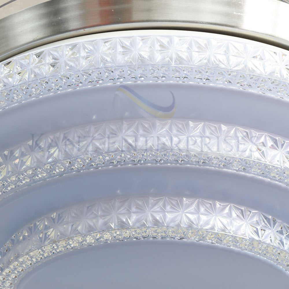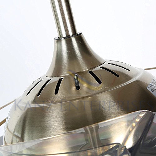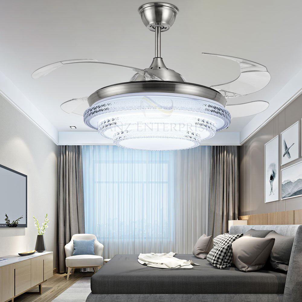 - The ceiling fan has 4 acrylic retractable blades, a diameter of 42-inch when the fan blades are extended. when you turn on the ceiling fan, the blades will stretch out, while when you turn off the fan, the blades will put inside automatically. Blades are not visible when in off mode